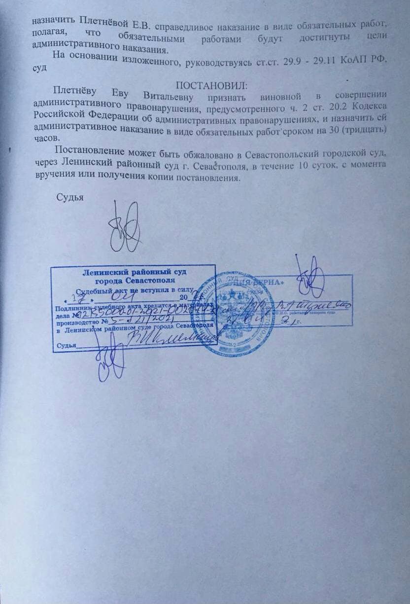 Ленинский районный суд Севастополя приговорил уроженку Евпатории Еву Плетневу, 2003 года рождения, к 30 часам обязательных работ за участие в несанкционированном митинге на площади Нахимова, который прошел 23 января текущего года. Суд состоялся 27 апреля, сообщает Telegram-канал «Рокот».